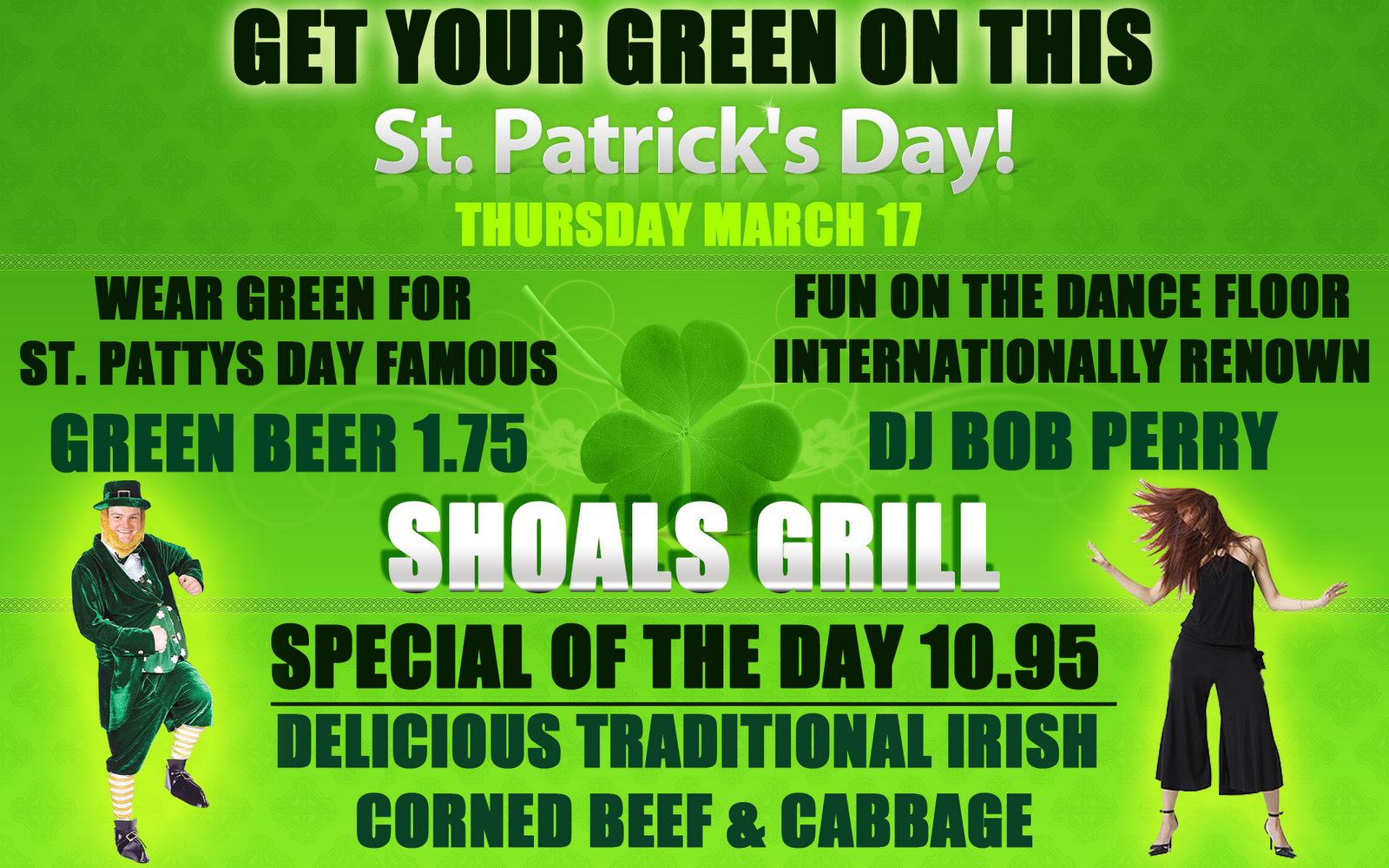 JOIN US @ SHOALS GRILL FOR ST PATTY'S DAY FESTIVITIES!!!May the sound of happy music, and the lilt of Irish laughter, fill your heart with gladness, that stays forever after.